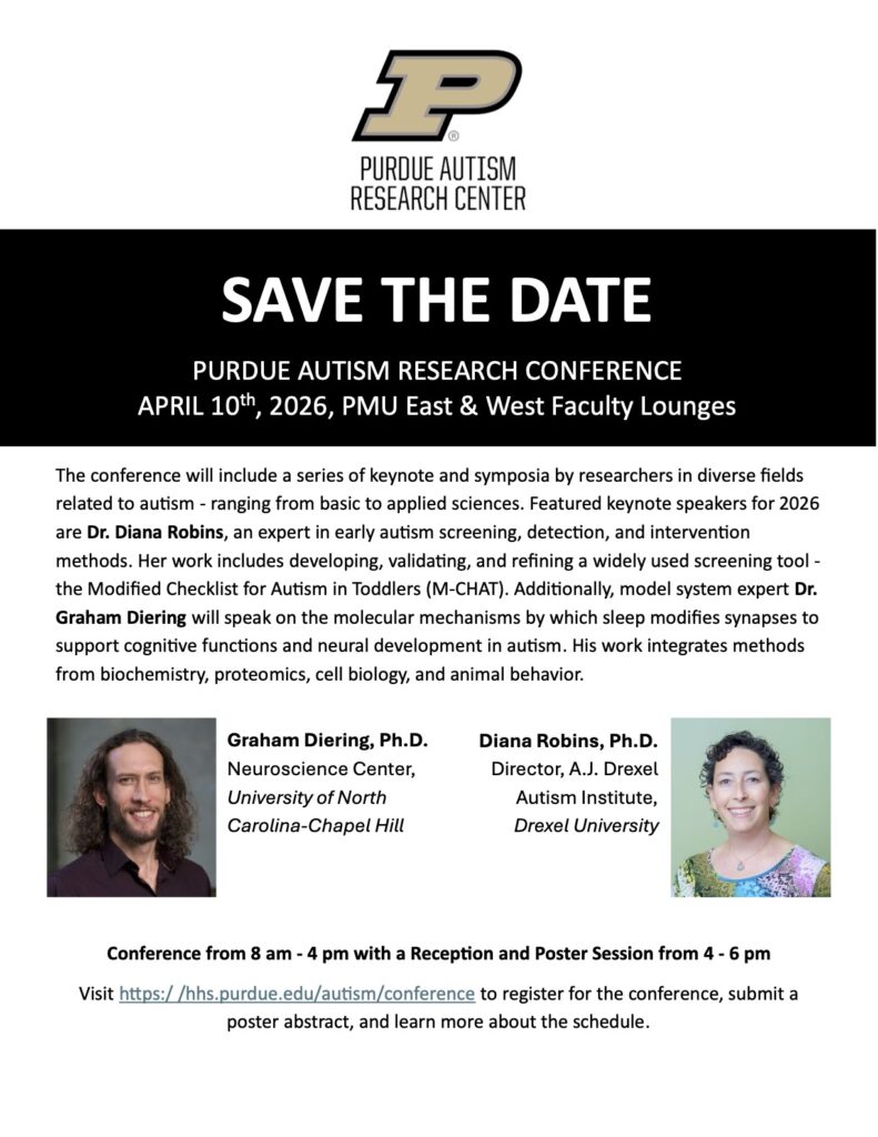 The 2026 Purdue Autism Research Conference will be held on Friday April 10th, from 8am-6pm at the Purdue Memorial Union – East & West Faculty Lounge. Registration and Poster submission will open in February.